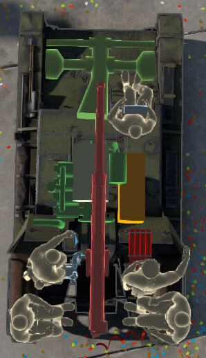 The tank’s luck lies in the crew placement: the crew operating the gun are put at the edges of the tank; because most inexperienced players shoot for the center, this tank has a better chance to survive. However, some shells will penetrate the armor, then explode and incapacitate or wound most of the crew. As for HE shells, there’s no need to even mention them because one hit can instantly wipe out the entire crew. On the right side are the commander and one loader; on the left are the gunner and the other loader. The driver sits at the left-front of the vehicle; while he is partially protected by the transmission, the 15 mm armor does not shield him well. For side attacks from the left, the engine and radiator can provide some cover. The engine, radiator and fuel tank are arranged in a row and can be destroyed by a normal side shot. Ammo is the least likely cause of incapacitation: there are only eight shells in the small wooden drawer next to the commander. If the tank is attacked from behind, you’re already dead in most cases — take out the four gun crew and you’re back to the hangar. The SU-5-1 is also a fighter’s treat — just a few MG bursts and you’re gone.