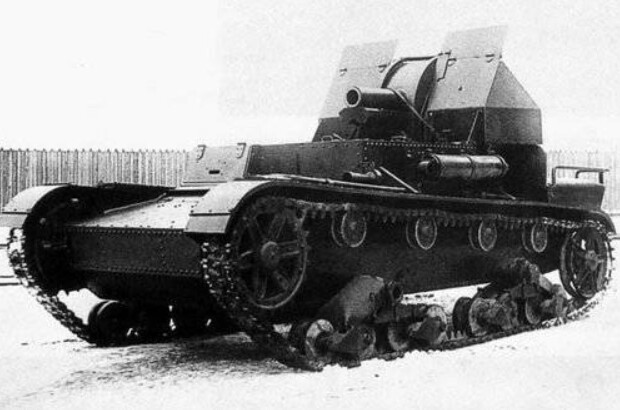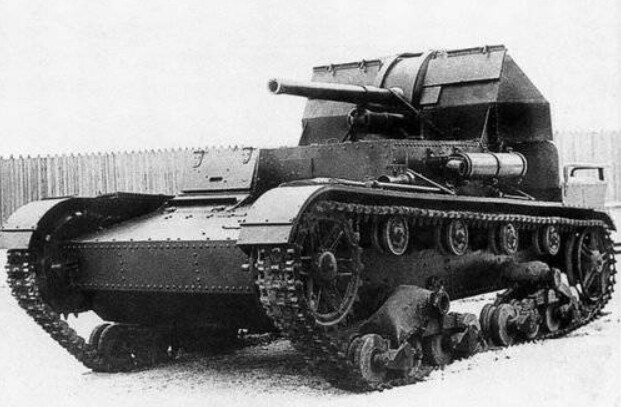 In 1934, the Soviet Union launched the “Small Triplex” project, aimed at creating a series of self-propelled guns based on the T‑26 light tank chassis. The turret was removed and the chassis was extensively modified, including relocating the engine to the center of the hull and redesigning the layout to accommodate a rear fighting compartment. The project reflected the Red Army’s growing emphasis on mobile artillery capable of supporting mechanized formations, providing firepower that could keep pace with tanks and enhance operational flexibility on the battlefield. The Small Triplex program marked an important early step in Soviet experimentation with self-propelled artillery and mechanized fire support.