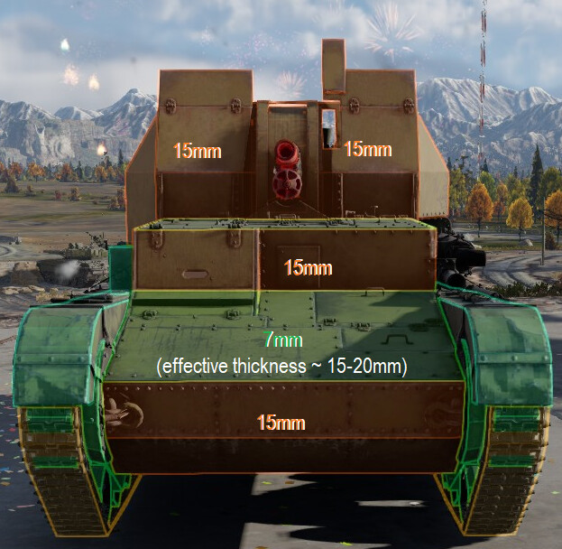 Every vehicle equipped with a tank gun can penetrate the front armor of this SPG. Moreover, heavier machine guns can penetrate the gunshield at close range. The crew operating the gun is protected by two plates of armor. The next 15 mm armor layer protects the radiator and the driver. If the radiator is hit, the shell will detonate, often damaging both the driver and the engine. Below that is a 7 mm armor plate. Because it’s sloped, the effective thickness is about 15–20 mm (from the perspective of a tank gun at normal height). This plate protects the driver on the left and the engine and transmission on the right. The final 15 mm plate protects only the transmission. Any hit here will completely destroy the transmission, but it will absorb most of the impact. Unfortunately, having the engine and driver fine won’t help if the transmission is busted. The sides are protected by just 15 mm of armor, and in the back, the crew is completely exposed.