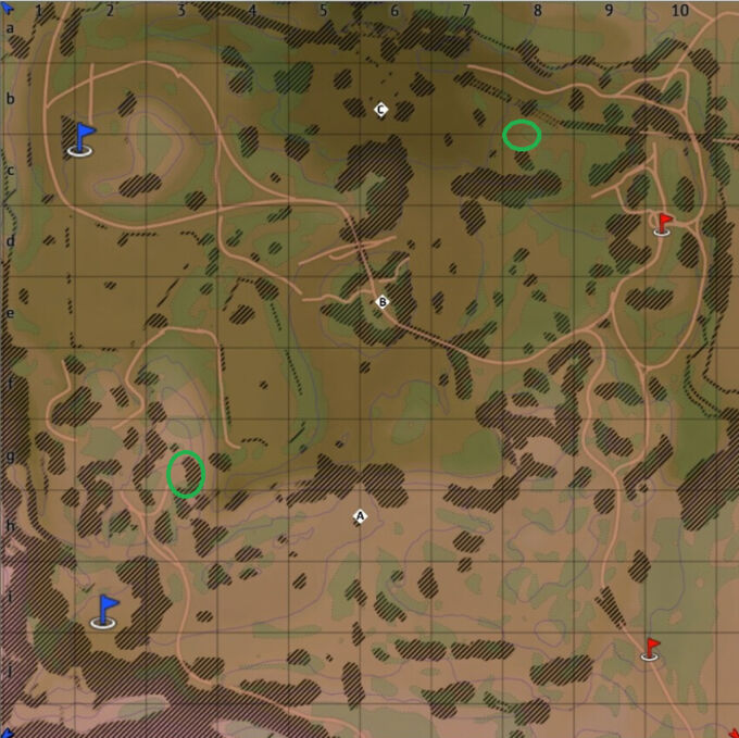 Another map suitable for sniping. If you are on the lower team (from this view), you can advance up the hill. From this position, you can engage any vehicle attempting to cross the road around the depression. Be careful not to expose yourself, as the SU-5-1 has very slow reverse speed. On the opposite side, you still have a good sniping opportunity from the upper green circle. From there, you can target any vehicle leaving the enemy spawn in that direction. Regardless of which side you are on, always be aware of enemy sniping positions. Rocks along the road next to the canyon provide poor sniping options due to the tank’s limited mobility.