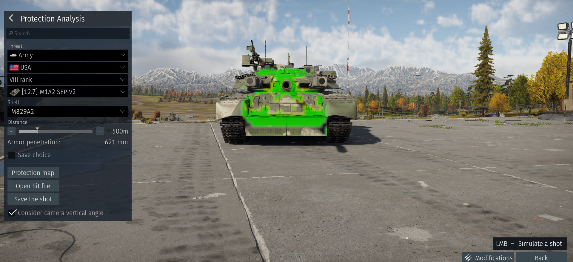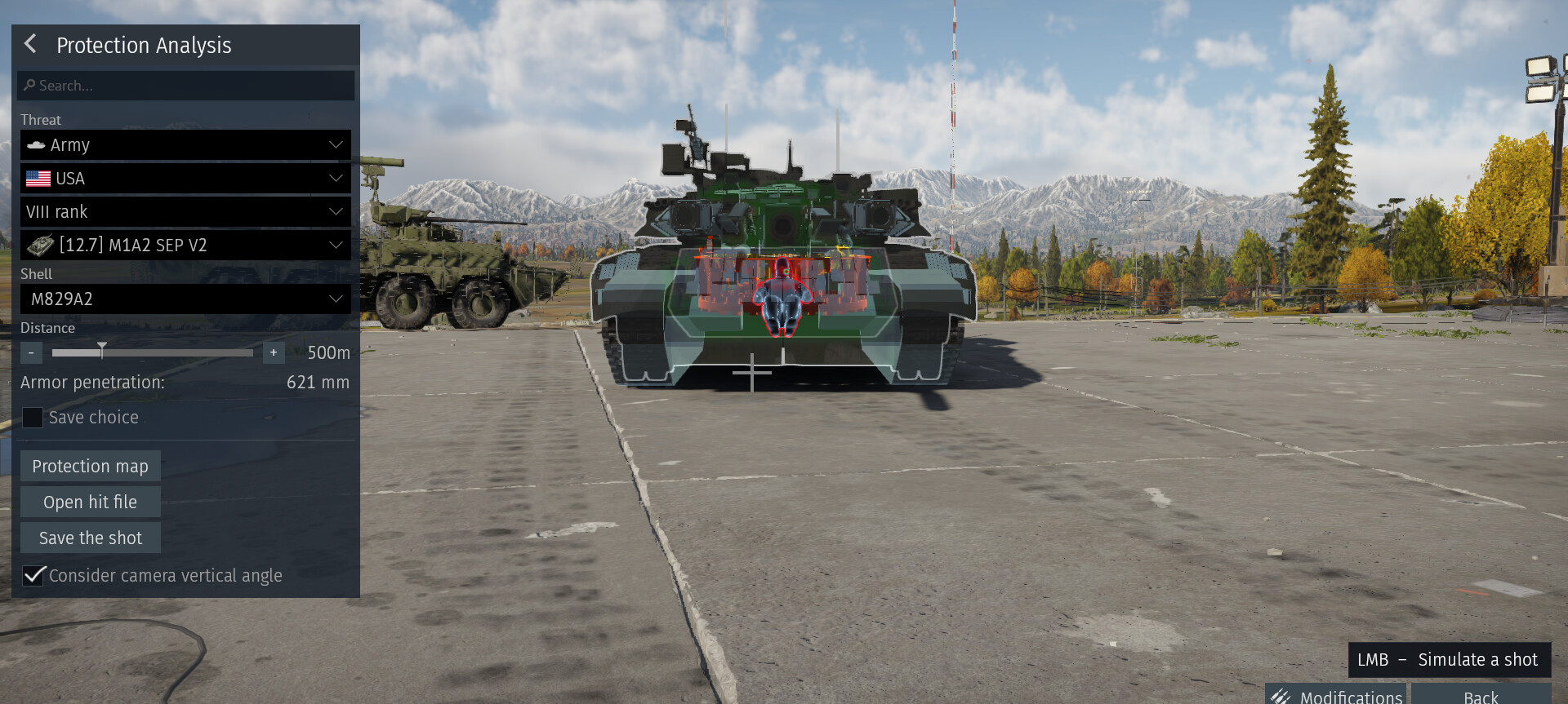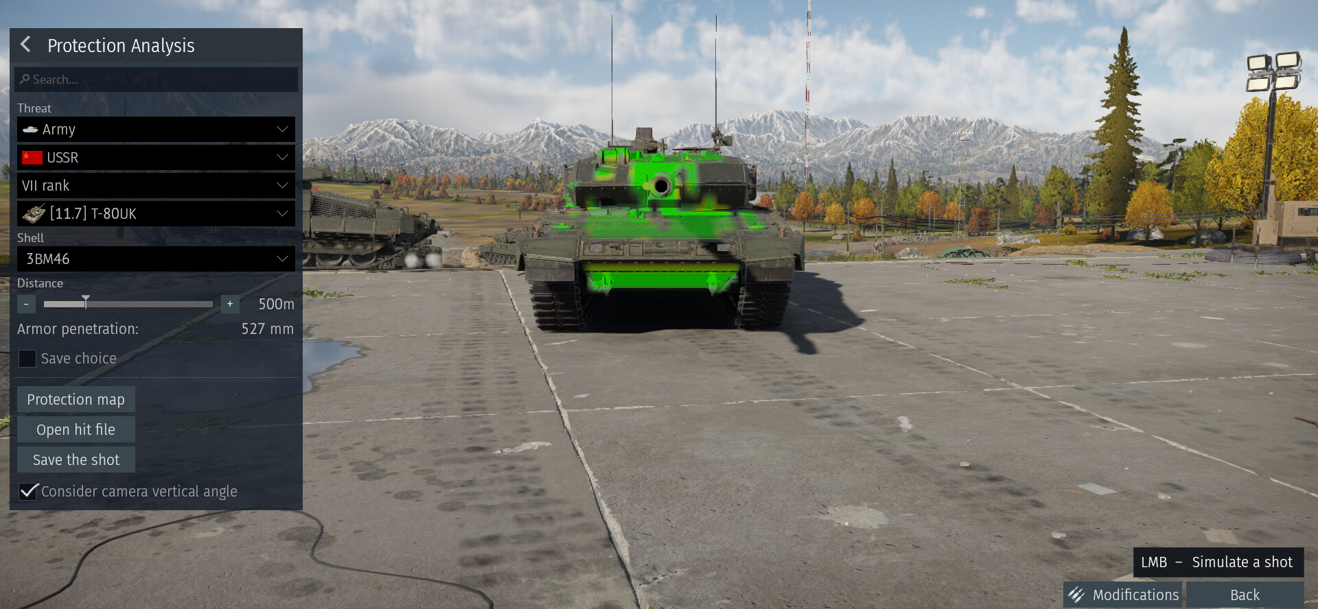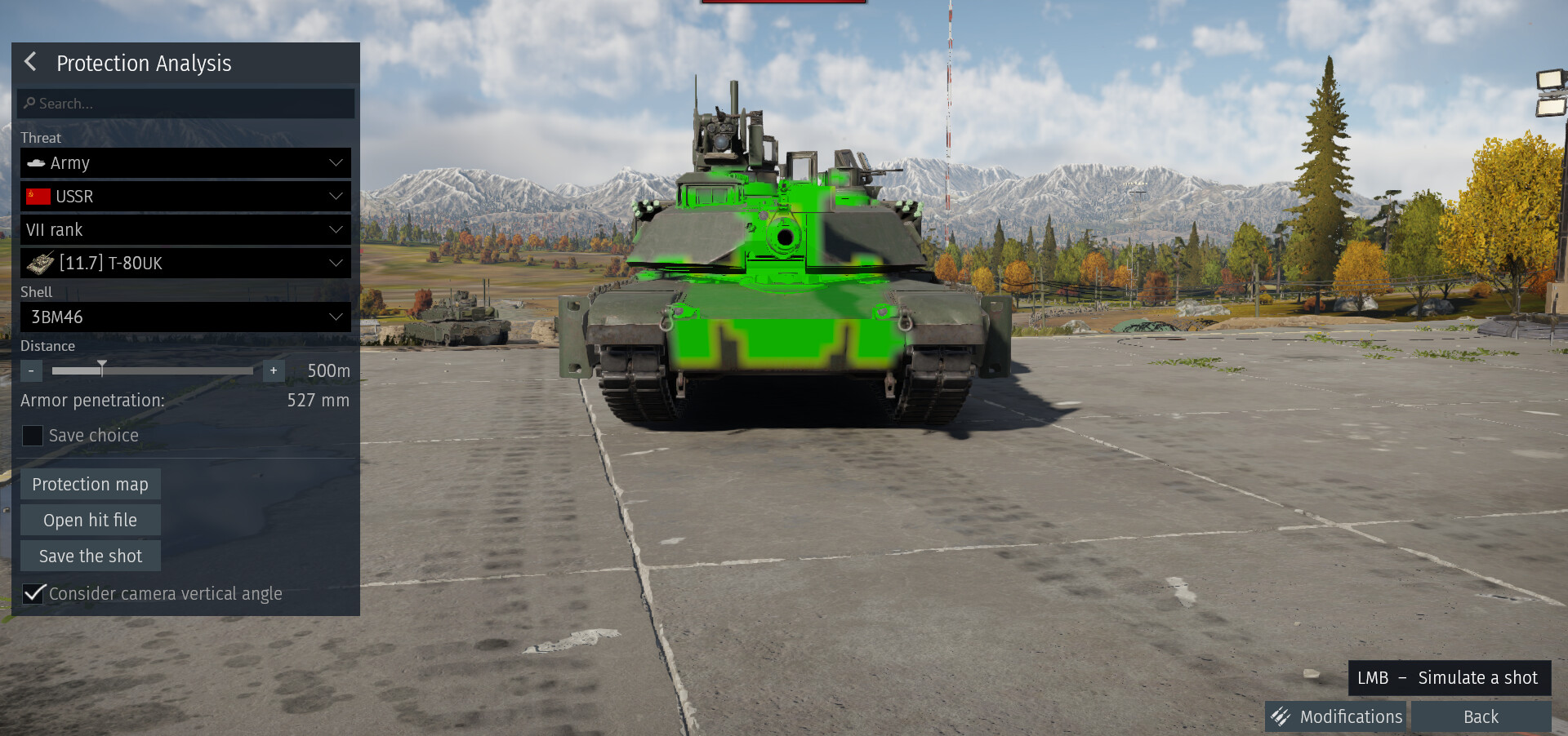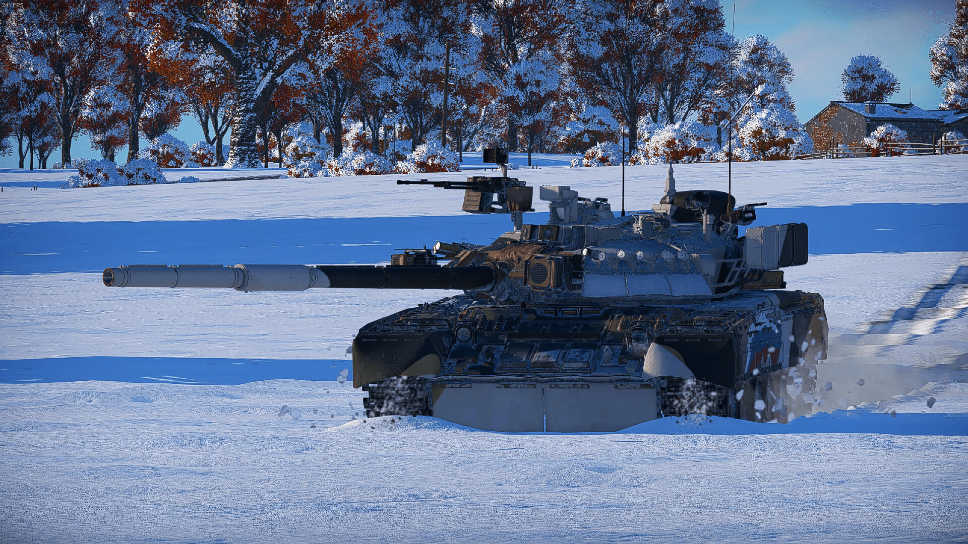 The armour of the tank is all around okay, with only the highest penetration rounds like outlined above being able to penetrate frontally. The frontal armour is about 550 mm equivalent, however this is nullified by the fact that there is no armour anywhere else to speak of. The lower frontal plate is a glaring weakspot, and shooting the turret next to the gun barrel can result in death. The sides and rear may as well not have armour, with almost anything able to penetrate that armour. This is why you always go hull-down in top tier. The tank comes with entrenching equipment if you want to be special. The low profile of this tank can do the same thing a hole can do anyway, making it harder to spot a T-80 than a M1A2 or Leopard. To be fair, the protection against kinetic penetrators is all around good, especially on the turret, it just struggles against late APFSDS, or the LOSAT.