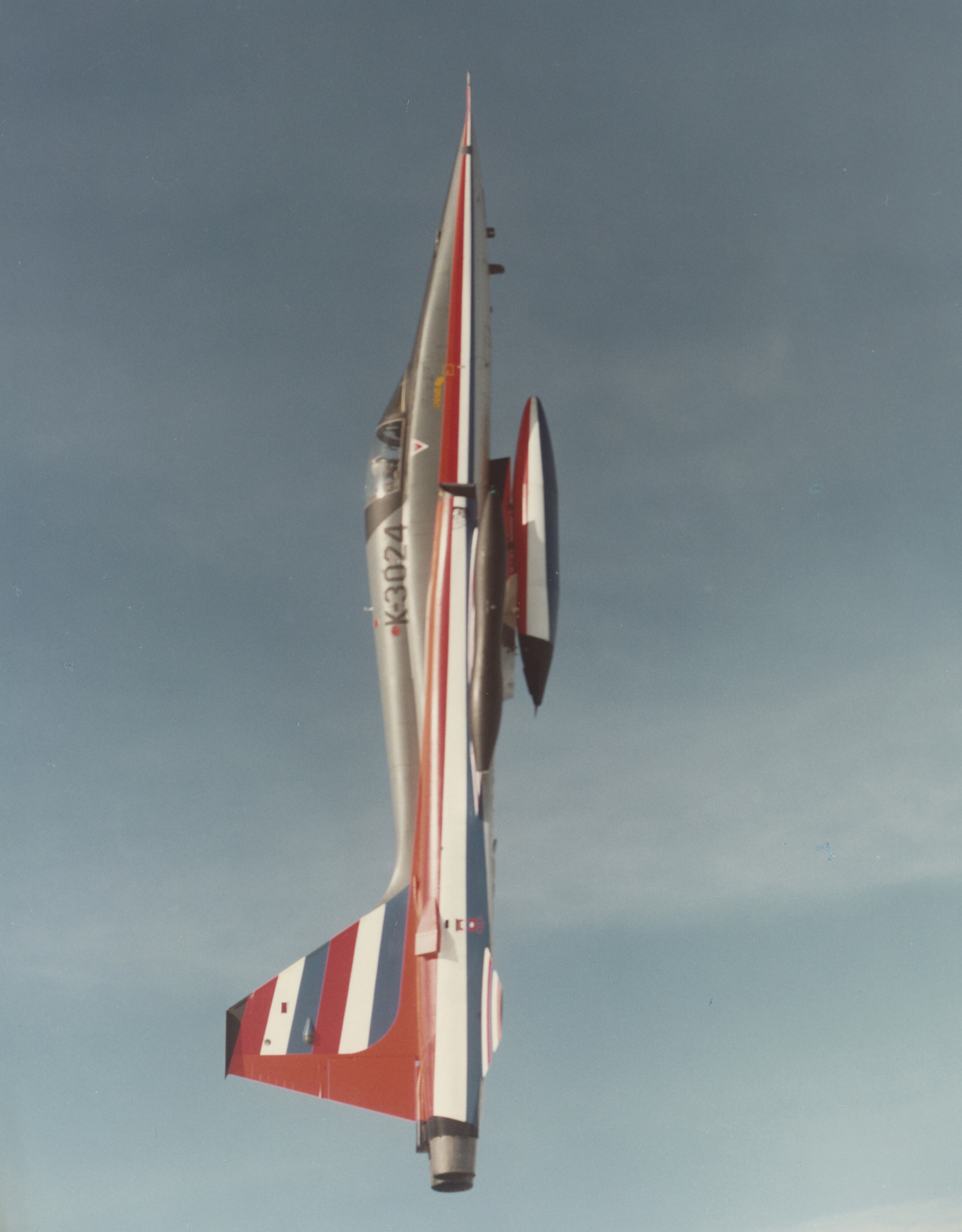 The first dedicated display aircraft, K-3012 and K-3014, were transferred from 316 Squadron due to their excellent technical condition and repainted at Gilze-Rijen. Their centerline fuel tanks featured a prominent red-white-blue ribbon, while their camouflage was adapted into a smart, high-visibility display scheme designed by Christiaan van Kooten. A photo mission with the Soesterberg photo flight followed on 18 March 1988, but technical issues grounded K-3012 soon afterward. It was replaced by K-3072, which was also repainted in the display colours.