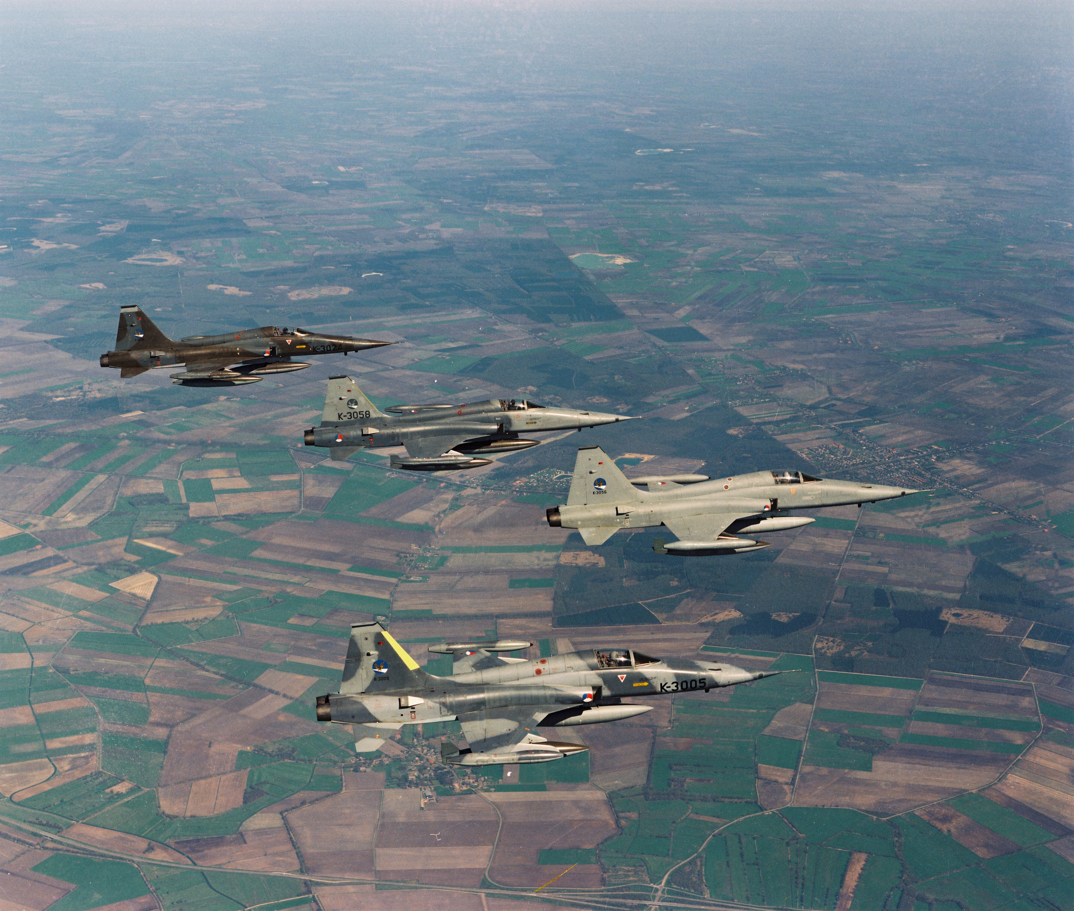 A four-ship formation of Northrop NF-5s from 313 Squadron, each displaying different camouflage schemes, is seen flying over the Zweelooërveld area between Wezup (beneath aircraft K-3005) and Schoonoord (ahead of the nose of K-3056). This formation showcased the main 4 varieties of liveries worn by the squadron’s aircraft during its operational career. Most of the liveries used were adapted to blend into the Dutch rural and urban landscapes.