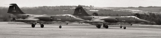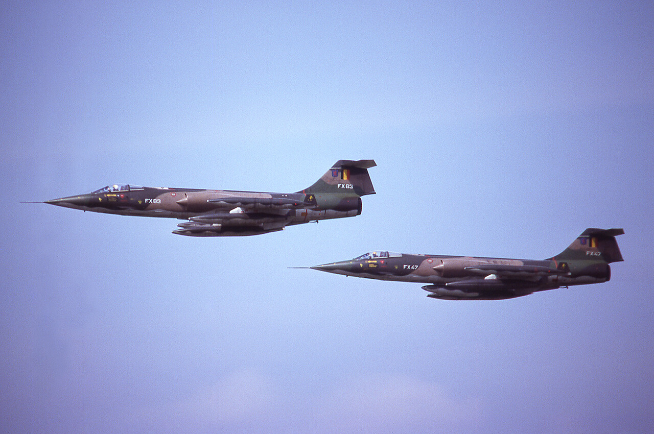 Belgian Air Force Lockheed F-104G Starfighters, FX-83 (Cambrai, June 1979) alongside FX-47 (Hits, n.d.).