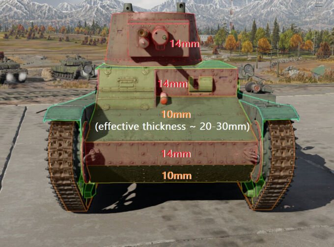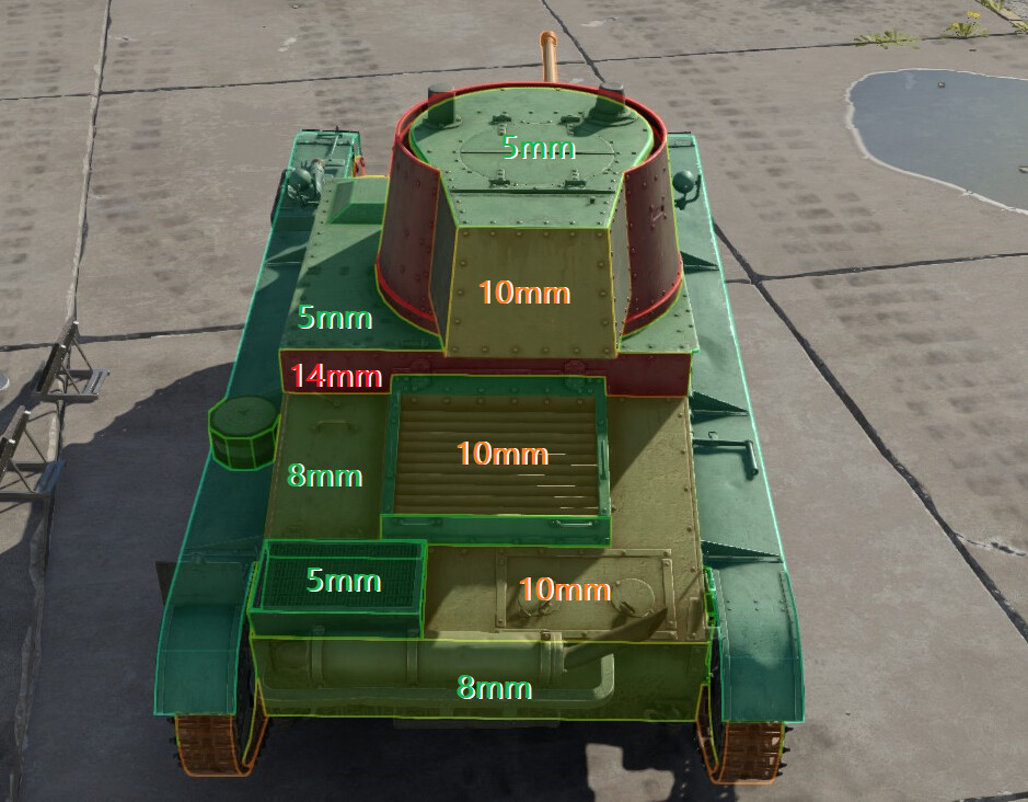 The back and top of this vehicle are not very well protected. The roof is only 5 mm thick, which can stop light armaments from aircraft from longer ranges but heavier weapons such as the 12.7 mm M2 Browning machine gun used on American planes can easily penetrate it, often wounding or even killing the gunner and loader. The plate supporting the turret is also thin (5 mm), but fortunately there are no critical components underneath. At the rear, most plates are 10 mm thick, providing adequate protection against light armament. However, on the left side there is a plate only 8 mm thick, which makes engine protection even worse. The vertical plate protecting the rear from ground fire is also 8 mm thick, meaning it can be easily penetrated.