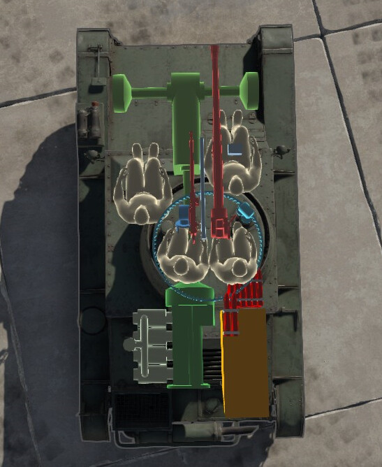 At the rear of the tank are the components responsible for mobility. The engine is in the middle, with the radiator on the left and the fuel tank on the right. Because of this layout, a strong side hit can potentially destroy them in a row. However, the radiator and engine are relatively “thin”, which lowers the chance of a fatal hit. Most of the ammunition is stored in front of the fuel tank, while a smaller amount is kept in the turret. Overall, the tank is vulnerable to any tank gun due to its thin armor, but the crew layout can still provide some advantage.