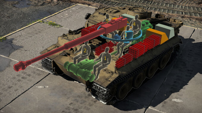 The Tiger I features a five man crew consisting of a driver (1), machine gunner (2), gunner (3), commander (4), and loader (5). The spacing of these crew members means that at times a penetrating hit may only incapacitate some of the crew, giving you a chance to retaliate against the enemy.