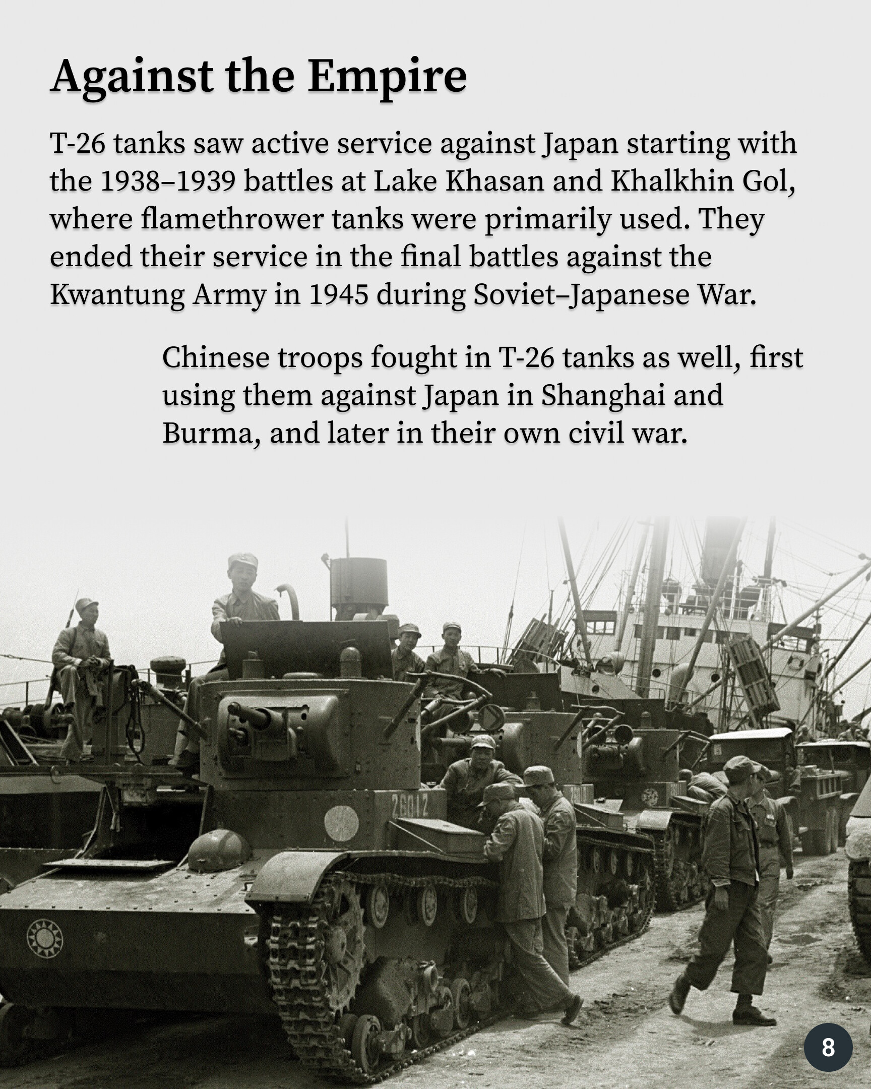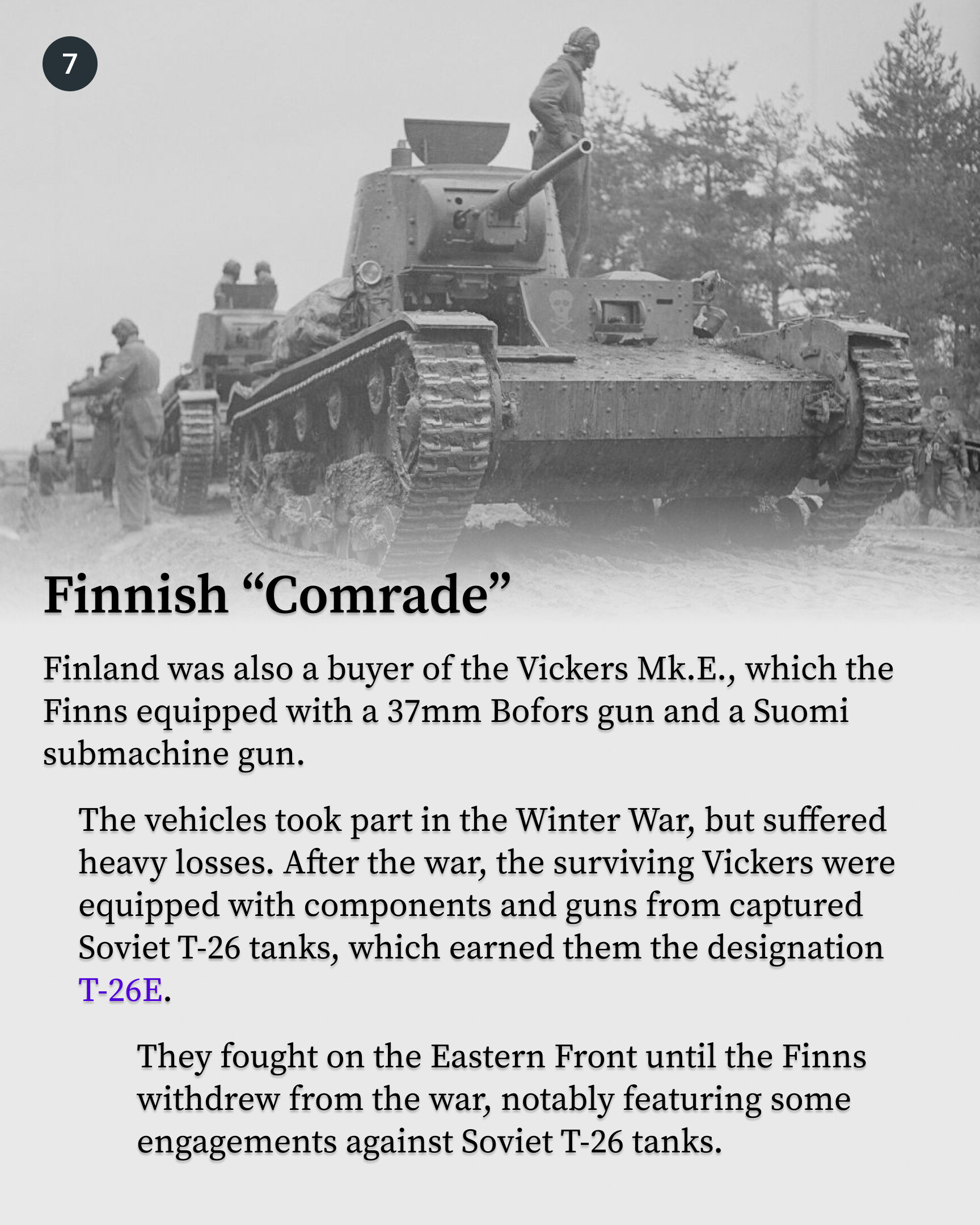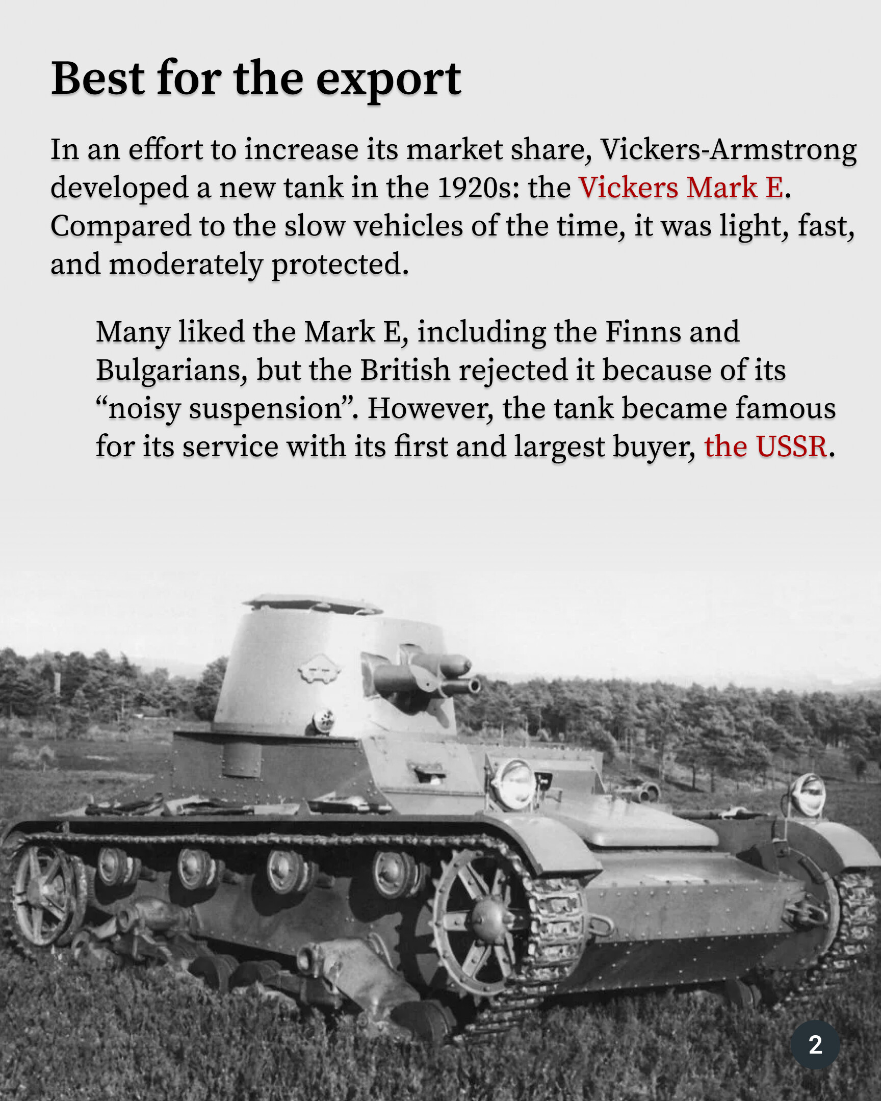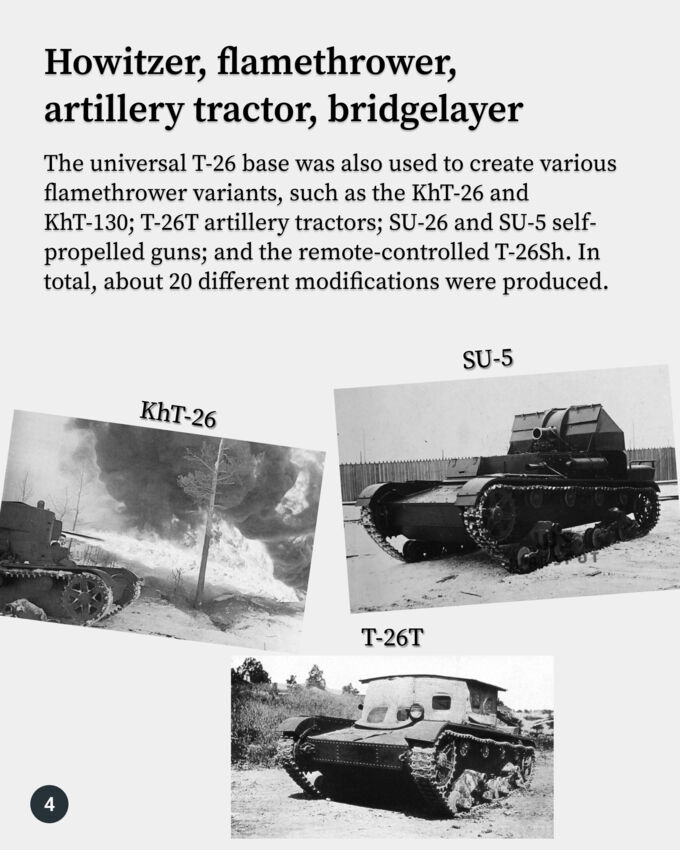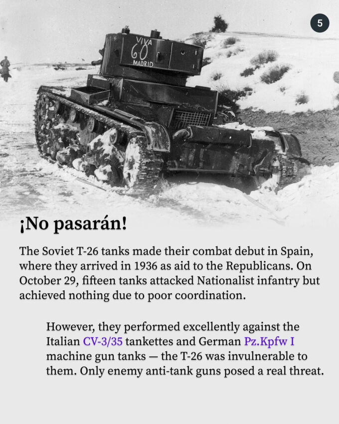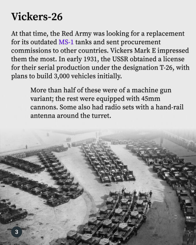 The British Vickers Mk. E had an unusual fate. In its home country, it never entered service or was produced in significant quantities. However, it became known as one of the best tanks of its time thanks to its production in the USSR under the designation T-26. Soviet tanks saw action in Spain, Finland, and China, and more than 10,000 were produced.