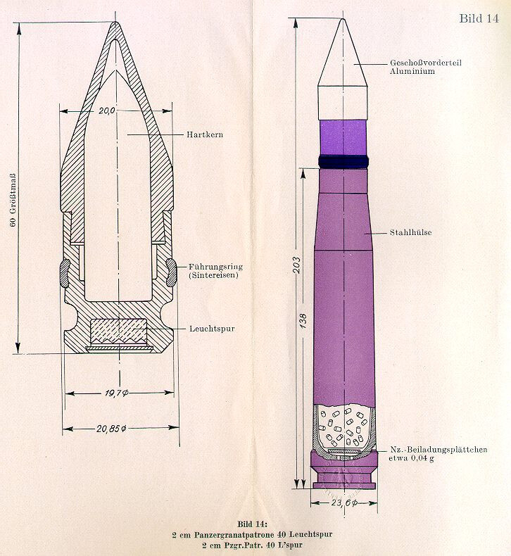 An HVAP/APCR round, exchanging weight and post-penetration effect for far higher velocity and penetration except at angles. Found either in a pure belt on KwKs or in a 50/50 belt with API-T on Flaks, it can be used in game against air targets due to the great ballistics and velocity of 1050m/s; however, the HE rounds are certainly more effective. The HVAP has good flat penetration, while the angled penetration of HVAP is usually lower compared to full-caliber shots, it can be ignored as most encountered vehicles have either thin armor anyway or are simply flat. There is nothing the Pzgr.40 cannot penetrate that the Pzgr. L’Spur can.