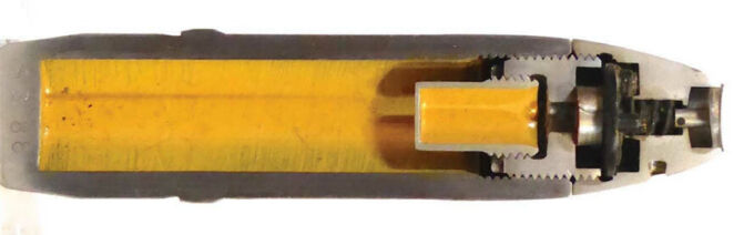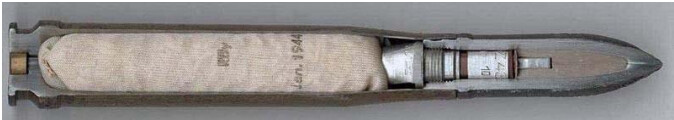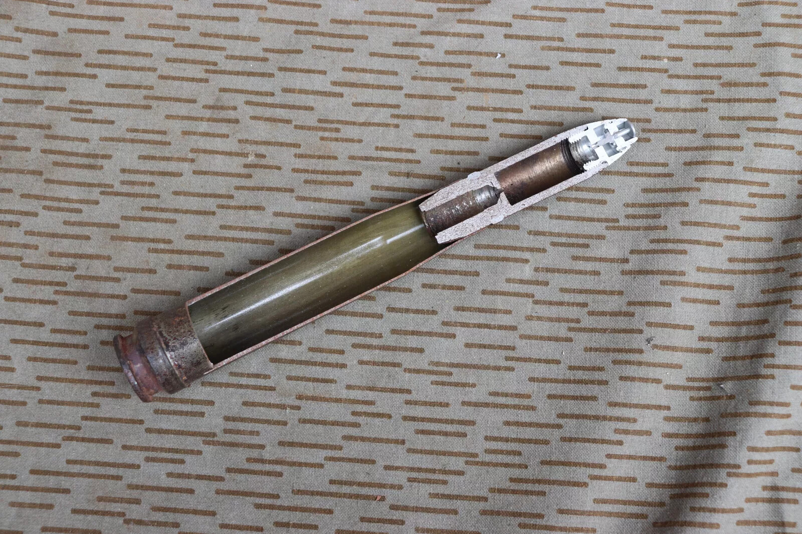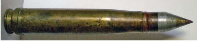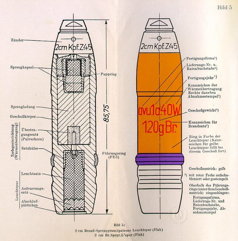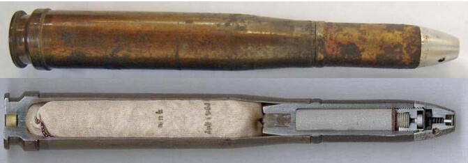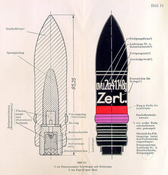 Note: Used against ground targets, both soft and armored. It contained a 3g white phosphor core. These were fully replaced by empty projectiles and later Zerl in the Desert and other hot places, as the phosphorus had a tendency to self-ignite in hot weather. The “Ph.” marked ones were standard with the filler; however, versions also existed without a filler, indicated by an “O.,” which weighed only 143g (see below). Fired from L/50 barrels at 780/800m/s and L/90 barrels at 850m/s.