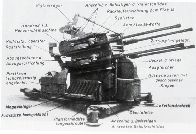 To give mountain troops adequate firepower, the 2 cm Gebirgsflak 38 L/65 was developed. This was a lightweight variant with a very simplified mounting and could be taken apart without tools in the field into three pieces for carrying. The mounting could be considered a mix of the Flaklafette 30 and 38, having component designs of both.