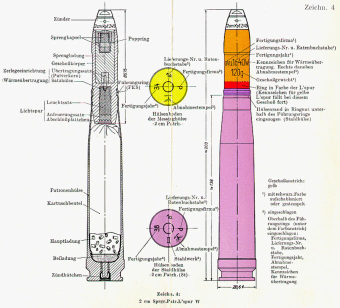 On a side note, in many books the barrel length is often written as L/55; however, it was L/50. Generally, with the 2 cm guns, the barrel length is often not written in German documents, however this case is documented W 127 Datenblätter für Heeres- Waffen, Fahrzeuge und Gerät and Merkblatt für das Waffentechnische Personal der Panzereinheiten (1944).