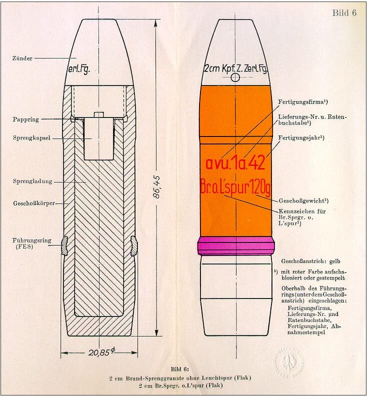 Note: Used only against ground targets. Another name is Spr.Gr.39. (The drawing is the Br.Sprgr. o.L’Spur, basically the same just with a different filler containing zinc.) Fired from L/50 barrels at 880/900m/s and L/90 barrels at 950m/s.