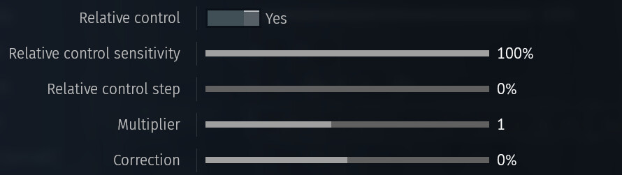 However, setting up the buttons to increase/decrease the axis value is just the beginning. Next, you need to set up the step at which the axis values ​​should change when you press the buttons and how quickly the axes should react to repeated pressing of the buttons. The settings for Relative control sensitivityRelative control stepMultiplier and Correction will affect how the game perceives pressing the specified buttons and how the axis values ​​will change.
