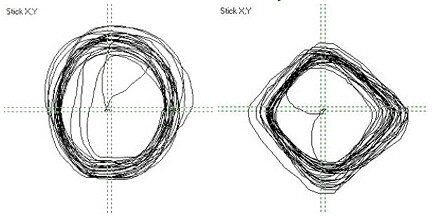 You can check the linearity of your controller’s response using the free program joytester2 (easy to find using Google). The easiest way to check linearity in this program is to simply move the joystick handle in a circle. If the response is linear, the joystick will draw more or less regular circles in the upper left part of the program screen. A nonlinear response will produce figures closer to a rhombus (see the picture on the right).