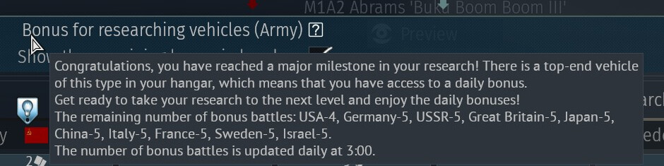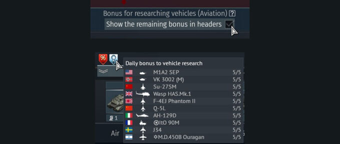 To see which nations still have research bonuses for the day, hover over this new block section in each of the Army, Aviation, Helicopters, Bluewater / Coastal fleet trees. In the example below, one battle for US ground vehicles has already been played.