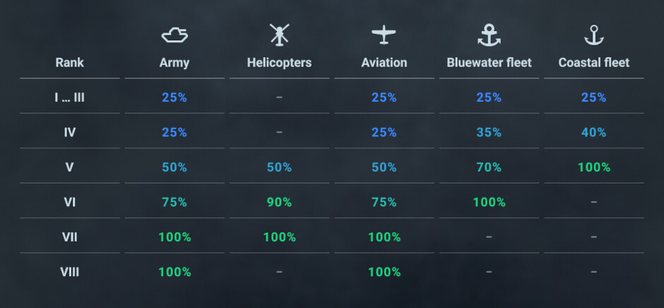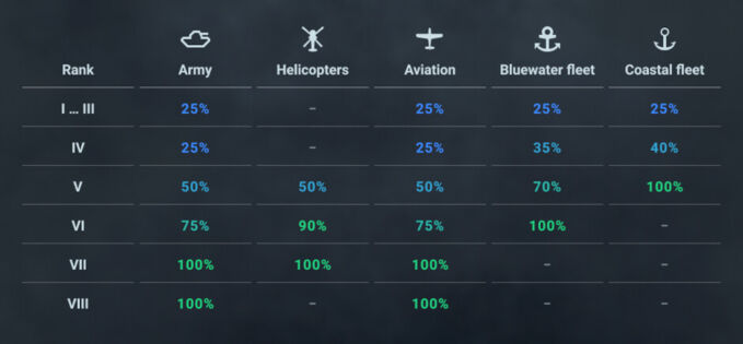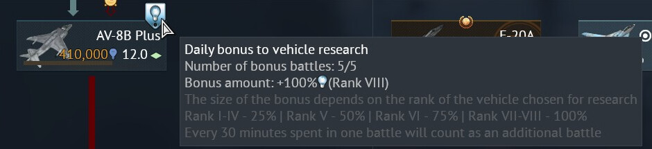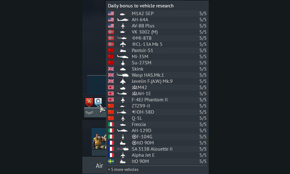 Each day, an independent research bonus for up to 5 battles will be available for each vehicle type (Army, Helicopters, Aviation, Bluewater, and Coastal) for each nation. The bonus will be available if you have unlocked and purchased a “top” vehicle of the same type in any nation.