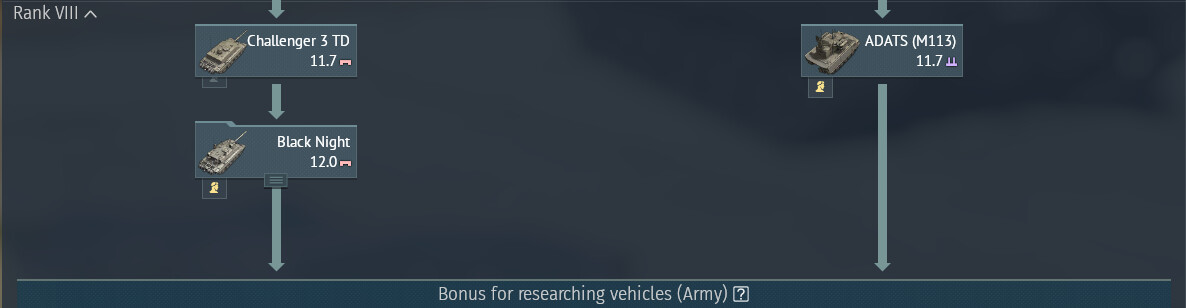 You can easily find the “top” vehicle by looking in the tree — it’s connected by an arrow to the new Research Bonus Block at the bottom. If at least one arrow from the “top” vehicle to the research bonus block in the research tree is not red, then the bonus is unlocked in this tree.