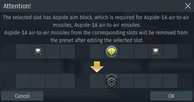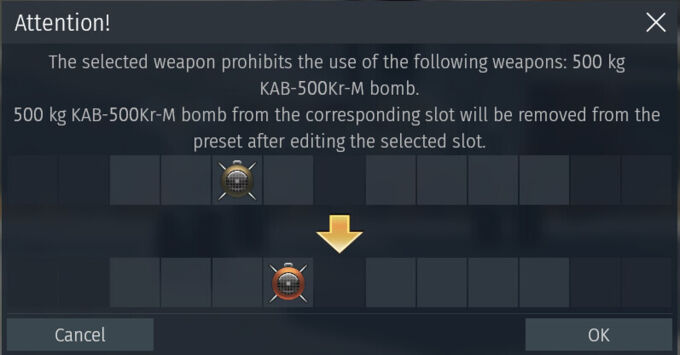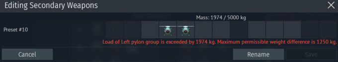 Some loadout options might also prohibit installing other weaponry on pylons next to it or require additional equipment to be used. If that happens, a menu will pop up, showing the incompatibility of said weaponry.
