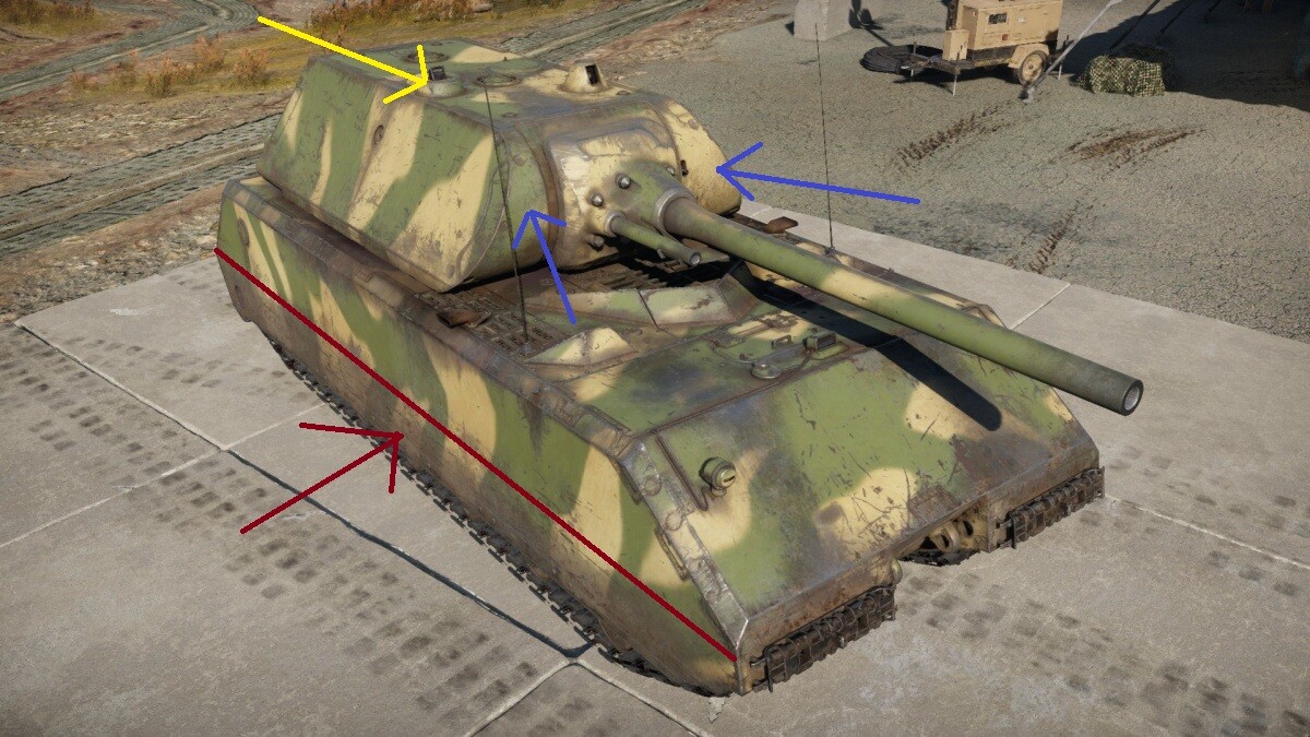 The Maus has some weak spots, as shown in the picture. First, the lower section of the side skirts, marked in red, can be penetrated by high powered AP rounds, though generally only from directly side on. The turret cheeks can be penetrated by more powerful HEAT, APCR and APDS rounds, as well as some particularly powerful full caliber AP rounds. Third, a 155mm HE round to the commander's periscope, marked in yellow, will overpressure the crew compartment for a one shot kill.