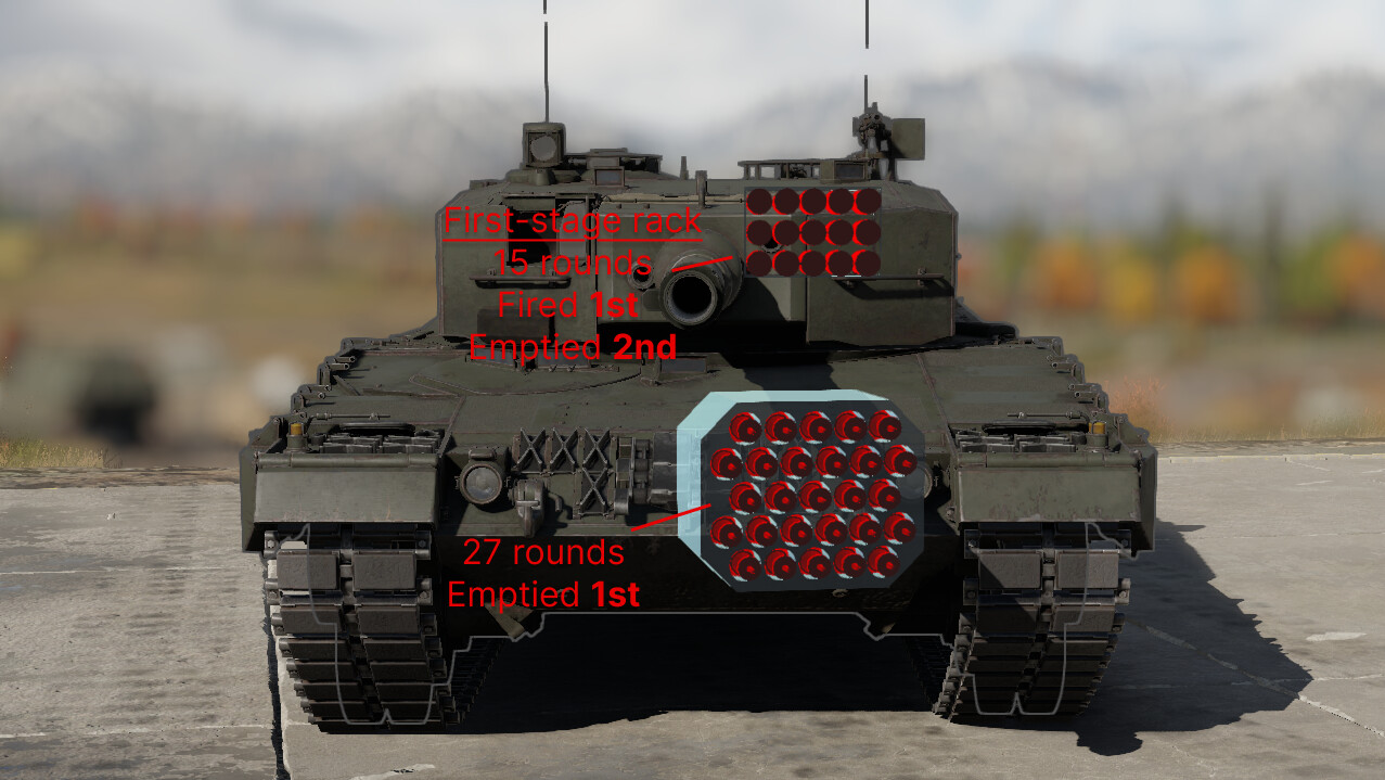 The Leopard 2A4, 5, and 6 all have the same two ammo racks, one in the front left of the hull and the first-stage rack in the rear left of the turret. Bring up to 16 shells to keep the hull rack empty, or as few as possible beyond that as the rack empties shell-by-shell, right-to-left, top-to-bottom.