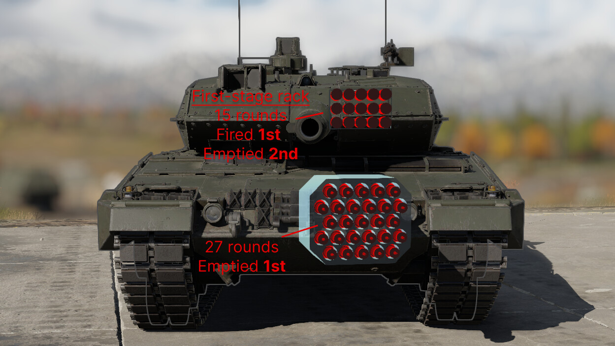 The Leopard 2A4, 5, and 6 all have the same two ammo racks, one in the front left of the hull and the first-stage rack in the rear left of the turret. Bring up to 16 shells to keep the hull rack empty, or as few as possible beyond that as the rack empties shell-by-shell, right-to-left, top-to-bottom.