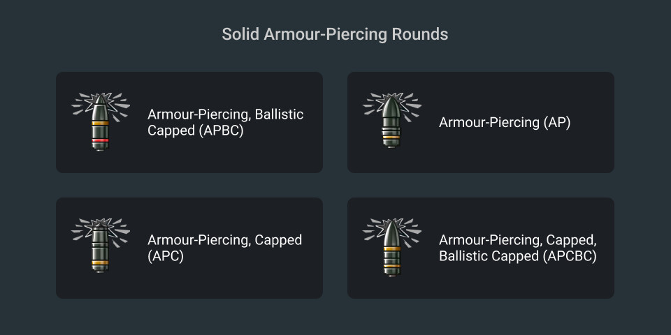 Solid AP rounds are a kinetic munition that utilise a hardened metal (often steel) shell with full-calibre diameter. The result is a simple, yet effective anti-tank round that will punch through armour with high equivalent thickness values, while retaining reasonable post-penetration effects which, when well-placed, can deal significant internal damage to components and crew directly within the shrapnelling path. The amount of spalling generated by a successful AP penetration depends on the shell mass and thickness of the penetrated armour and modules. Generally, solid AP does not stop until it has exhausted all of its force and is capable of passing through an entire vehicle if this energy is not fully expended.