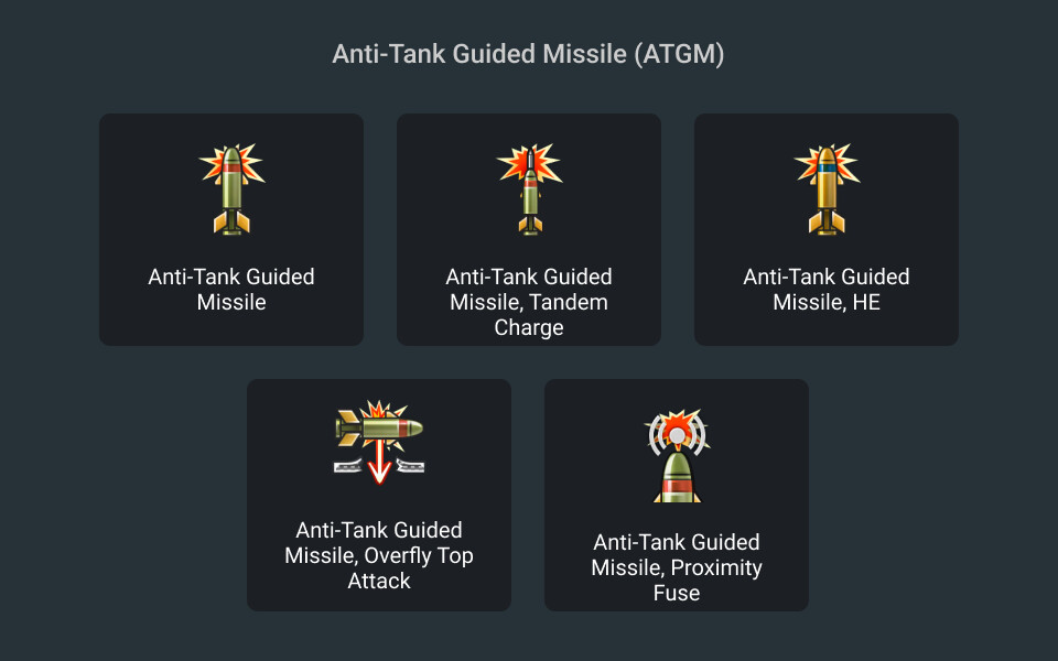 This missile's icon is the same as the normal ATGM, but its mechanism is completely different. It uses a proximity fuse to detonate above enemy tanks, sending the HEAT warhead right into the target's roof. Though this missile's penetration is rather low in the stats card, players should not be discouraged as tank's roof is one of the most lightly armoured area on all tanks. This missile type could also defeat tanks by overpressure effect alone, with a giant high-explosive warhead detonating through the top of tanks.