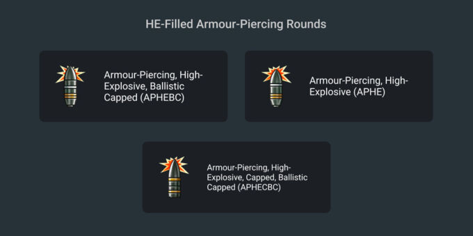 APHE rounds utilise a similar form to AP rounds, but incorporate a small chamber of high-explosive filler within the round. This often slightly reduces the round's mass and construction strength and as such APHE rounds tend to exhibit slightly worse penetration performance than their solid shot counterparts. However, upon successful penetration, APHE rounds often cause significantly more damage within a vehicle. APHE rounds have a fuse which will only activate on sufficiently thick armour.